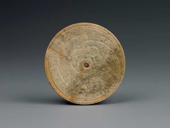 青黄玉质,局部受沁白化。圆形,中部有一圆穿孔,双面皆饰团身凤鸟纹,凤鸟羽翅外卷,凤首居中,圆眼,勾喙尖长。该器出土于墓主人下腹左侧,其旁有玛瑙串饰,所以本器应是串饰组件之一。