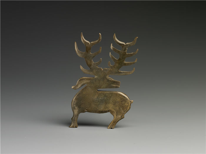 青玉,受沁呈灰褐色。此件玉鹿为回首站立状,雕琢简洁明快,鹿角与鹿的比例接近1:1,高大的鹿角如树枝分叉,左右对称耸立于头顶,双目微翕,鹿唇紧闭,尖耳下垂,短尾上翘,寥寥数笔刻画出一头在山野中闲庭信步,闭目遐想的鹿。