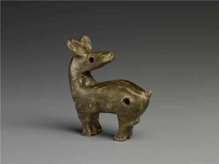青玉,微受沁,圆雕,回首站立状,无角;此玉鹿是国墓地出土玉鹿中唯一一件圆雕且没有角的鹿,圆润健美,活泼可爱。鹿出土于墓主人颈部和胸部之间,周围有玛瑙串饰,且眼、臀、蹄部都有穿孔,可能是串饰上的组件,穿系方式难以判断。