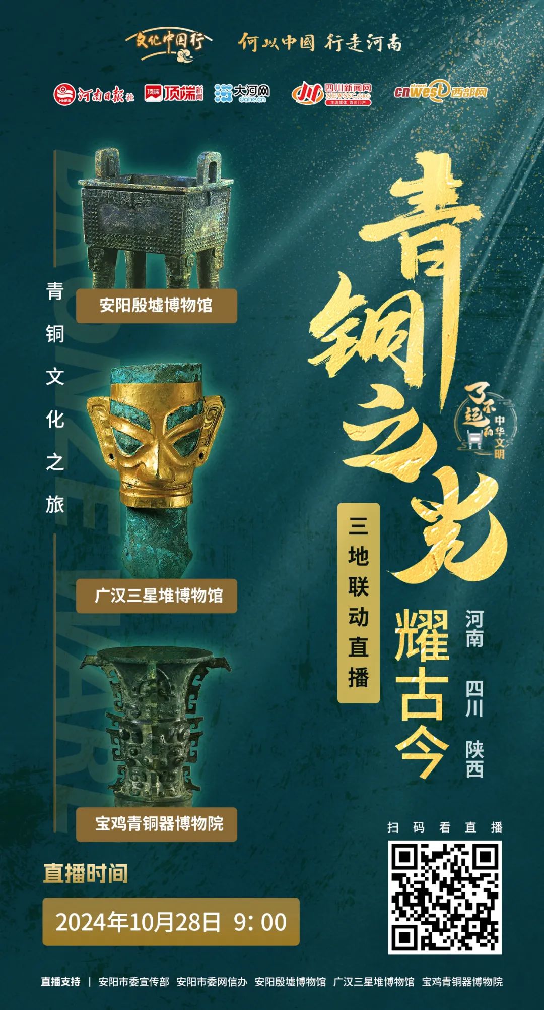 10月28日,大河网、四川新闻网、西部网联合推出“青铜之光耀古今”直播活动。从殷墟博物馆、三星堆博物馆到 ,聚焦河南、四川、陕西三省博物馆的顶流藏品,展开一场超时空对话,带领广大观众一同欣赏青铜器的魅力,感受青铜时代的文明之光。