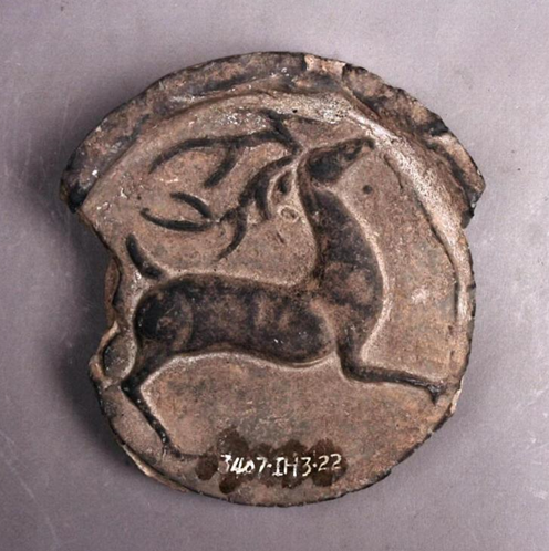 馆藏的这面鹿纹瓦当出土于凤翔秦雍城遗址,残径12.5厘米,残厚3.5厘米,重0.6千克,现藏 。当面装饰浅浮雕奔鹿纹,鹿角粗壮高扬,短尾向上,两腿细长向前奔跑。此鹿形神兼备,简明生动,夸张发达的双角长达身躯的一半,脖颈长而有力,十分立体,将鹿健美的体型和机灵聪敏的习性表现得淋漓尽致。