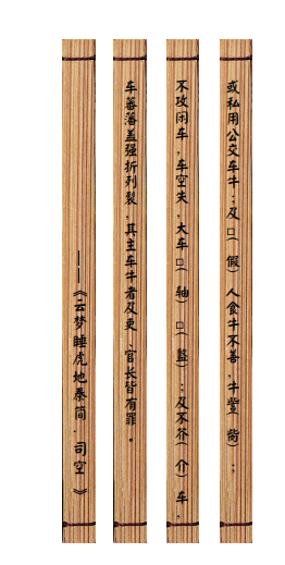 《云梦睡虎地秦简》:云梦睡虎地秦简于1975年出土于湖北省云梦县睡虎地村秦墓之中。其中记载了秦国二十余种法律原文及六百余项法条,内容涉及农业、仓库、货币、贸易、徭役、军爵等方面,其中《司空》《置吏律》《行》《内史》《尉杂》是规定官员权责的法律。