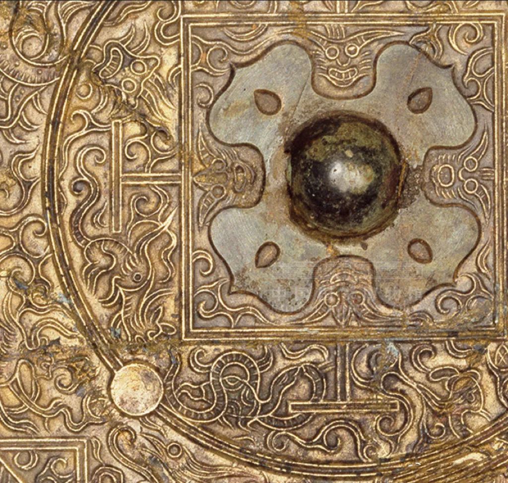 这件铜镜镜钮呈圆形、四叶纹钮座。镜背采用特殊的鎏金工艺,以四枚乳钉所附着的一周弦纹圈为界,将纹饰所在空间分为内、外两区。