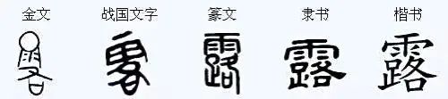 “露”篆文从雨,路声。由“路”字和“雨”字组成。《说文解字》解释为“润泽也,从雨路声”。这里是由本义露水引申为润泽之义。