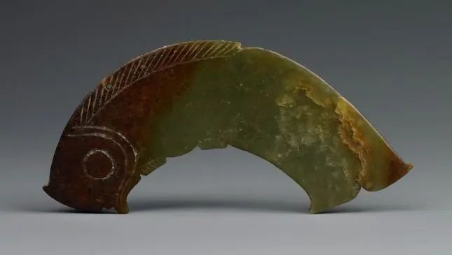 国墓地出土。长11.4厘米,宽3.2厘米,厚0.15厘米,重0.022千克。青玉质,墨绿色,头端为红褐色,玉质晶莹,鲜润透明。鱼呈圆弧状,宽单阴线刻划鱼目、鳃,细单阴线刻划鳍,鳍部有一双向打孔的穿。该器与同墓出土的西周玉鱼(乙)为一对,玉质,器形完全相同,应是对开成型工艺,是我们研究西周玉器加工工艺的可靠资料。