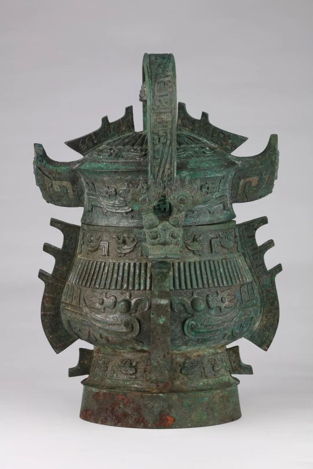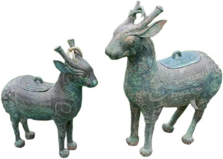 M4出土的一大一小2件牺尊尤其可爱,造型近同,唯大小有别,局部纹饰稍有差异。主体为鹿形,综合了草食类、肉食类动物诸特征。鹿首特征明显,圆目凸起,鼻、吻分明。长角分叉,阔耳直立,颈部弧线优美。体长肥硕,四肢健壮,驻足静立,前直立而后微曲。爪状足,趾明显,底平。腹空,两侧有鳍形翼,背有盖。盖面弧曲,有桥形钮。三角状短尾,微翘。牺尊体表纹饰繁复多样,以鹿首、凤身为主体图案,沿脊线对称分布。纹饰线条以浮雕宽带纹为主,附有阴线云纹,云雷纹衬地。牺尊形象奇特,憨态可掬又不失机敏,动感十足,栩栩如生, 萌萌的样貌惹人怜爱。