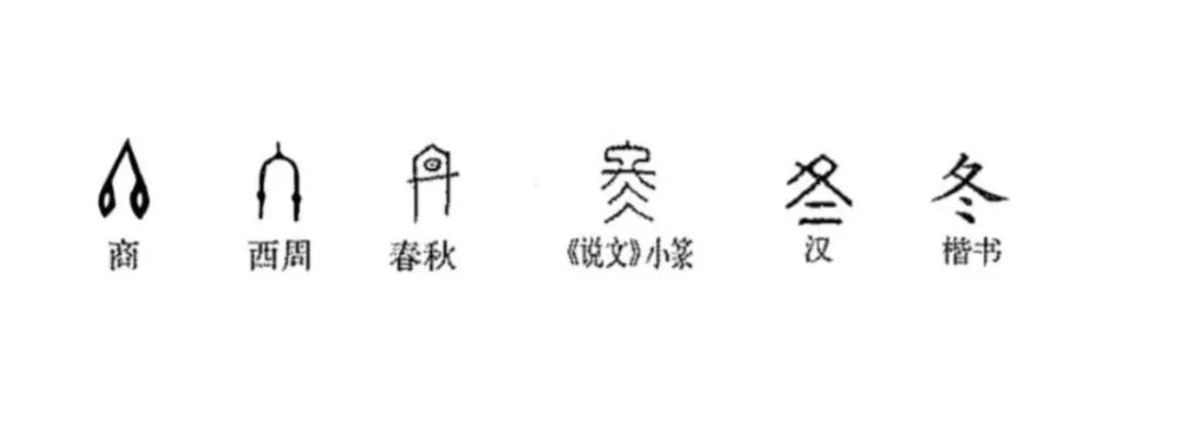 “金文“冬”字与甲骨文形体非常相近,但和甲骨文形体相差较大,这个形体像一个封团的房屋,屋内是一个太阳,大致表示太阳不出来,即天空无太阳照耀,用来表示冬天。《说文解字》收录的字头正篆的形体基于金文的形体进行了改造,金文形体中的“日”消失了,形体下面换作表示冰的部件“仌”,不见太阳而只见冰,就成了冰天雪地、滴水成冰的冬天了。