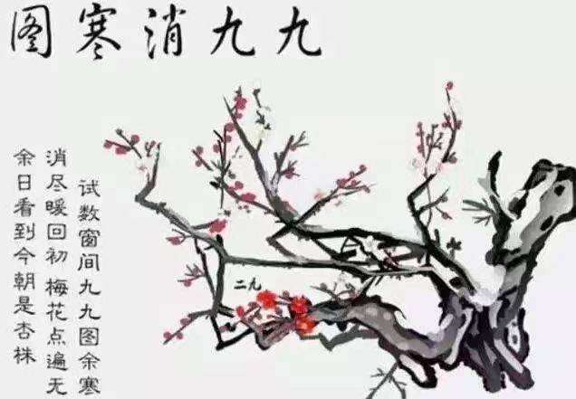 所谓的画九,实则是冬至后计算春暖日期的图。明代《帝京景物略》载:“冬至日,画素梅一枝,为瓣八十有一。日染一瓣,瓣尽而九九出,则春深矣,曰九九消寒图”。“九九消寒图”有三种图式,分别为文字、圆圈、梅花三种。