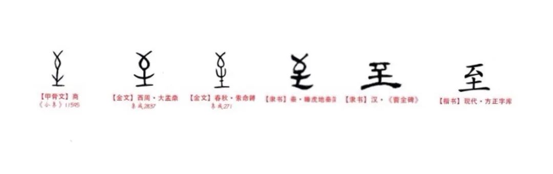 金文的“”字,下面不是一而是土,更加明确了地板、地铺的含义。篆文的至字,承续金文字形。