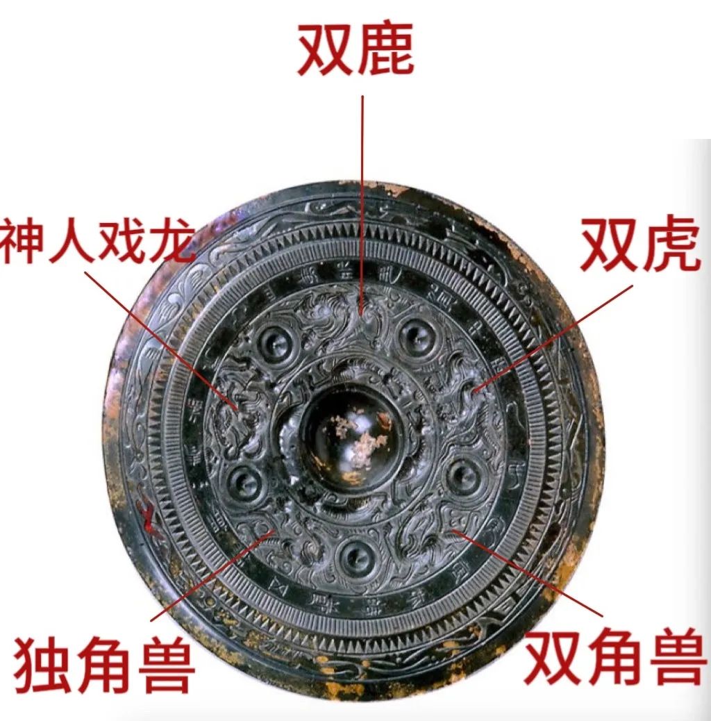 镜背中装饰有独角兽与双角兽,这两种神兽可能是古代传说中的“天禄”和“辟邪”(似鹿而长尾,一角者为天禄,二角者为辟邪,可攘除灾难,永安百禄,迎祥纳福)。
