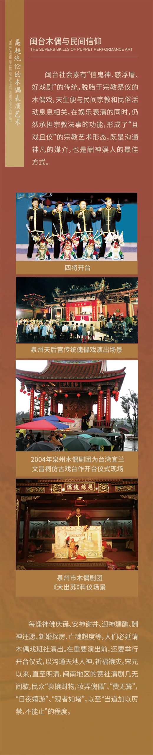 宝博的粉丝们大家好!《指掌春秋——闽台木偶艺术展》第四期来啦! 本期内容非常丰富,将从“闽台木偶与民间信仰”、“剧目与舞台”、“提线木偶戏——线位与钩牌”、“掌中木偶戏——动作程式”、“行当名色”、“木偶戏的语言艺术”、“乐器与后场”等方面,向大家讲述高超绝伦的闽台木偶表演艺术。