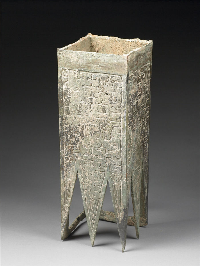 何尊造型优美,上圆下方,通体有四道扉棱,上部纹饰以芭蕉叶和蛇纹点缀,腹部和下部分别饰以高浮雕、浅浮雕的的兽面纹,纹饰疏密有致,凝重而富有变化