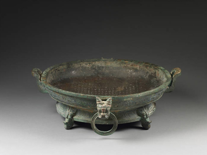 历史价值:盘为水器,一般与匜配套使用,用于古人行沃盥之礼。该器造型优美,腹部及圈足处装饰窃曲纹,铺首为兽首衔环,盘外部布满翠绿色铜锈。它是杨家村窖藏出土青铜器中史学价值最高的一件。盘内铸铭文21行372字,详细记述了单氏家族8代人辅佐西周从文王到宣王共12代天子征战、理政、管治林泽的历史。铭文大意为:逨说,我的赫赫有名的皇高祖单父,威武英明,知人善任,是一个有智慧有德行的人。他辅弼文王、武王,讨伐殷商,接受皇天大命,抚佑四方的诸侯国,建立了周王朝,操劳国家,顺应天意。我的皇高祖公叔,能辅佐成王,为王所使,接受大命。(当时)北方的戎狄不来奉献天子,(成王)安定了四边万国。我的皇高祖新室仲,沉稳英明,安远善近,四方诸侯都来朝见康王。但是鬼方背叛朝廷。我的皇高祖惠仲盠父,善和于政,成于谋略,奉侍昭王、穆王、经营四方,讨伐楚荆。我的皇高祖零伯,耳聪心明,尽职心责,侍奉龚王、懿王。我的皇亚祖懿仲,直言规劝(四方左右庶民),(协助)孝王、夷王治理国家,有成就于周邦。我的已故父亲龚叔,端庄恭敬,严肃谨慎,和询于政,德行显著,辅佐厉王。逨继承我的祖父、父亲的职事,夙夕恭敬自己的职责,故天子多赐逨休。天子万年长寿无疆,保佑周邦,治理四方”。
