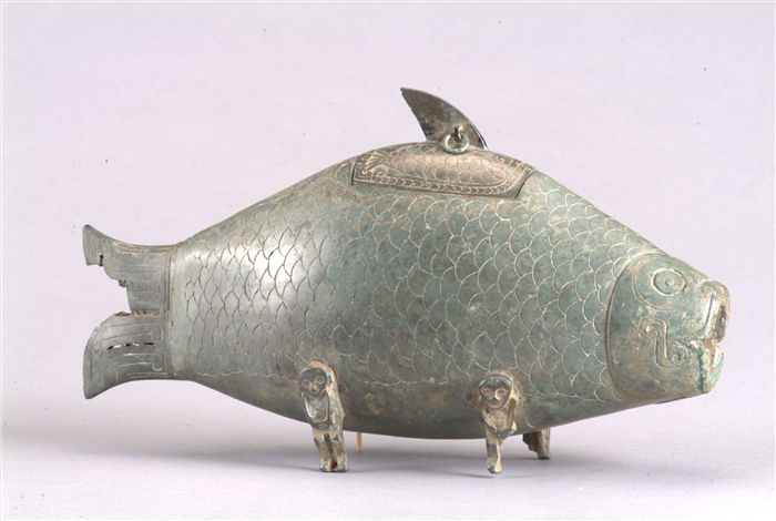 盛酒器。通体作鲤鱼形,鱼身肥硕,分尾,口微张,口内中空,但有隔,不与腔体连通,下唇口沿正中处有一小穿孔。圆眼,眼以粗阴线勾眼圈及瞳孔,眼外侧以细阴线勾眼眶,两侧腮部有一简化窃曲纹状鱼须,鱼体两侧遍布阴线鱼鳞纹。鱼背部有长方形开口,上设一盖,与鱼身开口相扣合,盖面设背鳍状钮,作钮两侧下部各设一半环形钮连一钮环。盖面两侧各饰一细阴线雕鲤鱼纹,边沿饰两龙蛇状纹,盖沿后缘饰阴线窃曲纹。鱼腹下设4人形足承托。鱼尊器形逼真生动,优美典雅,堪称青铜艺术珍品。