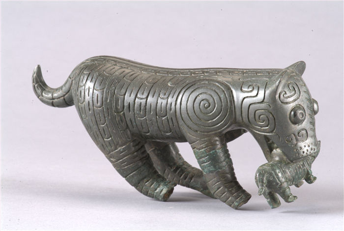 立体圆雕。大虎作张口匍匐状,虎头上竖一对耳,前倾.半球状二目突出,瞳孔深陷,双眉作阴线勾云纹上翻,鼻梁以十一道阴线“V”字形纹装饰,面颊饰阴线云纹和圆凹点,象征虎须。鼻吻部平素,张口露齿,口衔一小虎,小虎倒颈,口向上大张,呈惊恐状,四足及尾部自然下垂,小虎身体遍布直线与点状纹,以表示其斑纹。肩侧饰阴线旋涡纹,虎身及四足皆环饰重环纹间条带纹。该器造型精美,设计巧妙,是一件难得的艺术珍品。