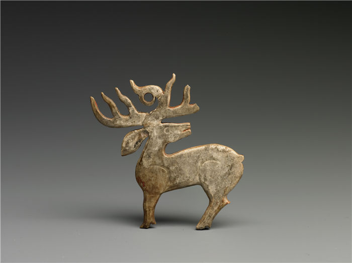 青色玉质,受沁呈灰褐色。玉鹿为片雕,回首站立状;表现的是一头行进中的鹿,因生好奇,回头张望的状态。微微向上扬的头和充满好奇的双眼,似乎在找寻着什么;拱起的背部、蹬地的后肢、上翘的短尾以及两条阴线刻划出的鹿腿部强健的肌肉,表现的正是鹿在行进中戛然而止的瞬间。鹿角的枝丫自然卷曲成圈,形成穿系的孔,此玉鹿出在墓主的头部,可能是头部的饰物。